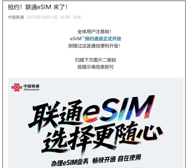2025 年 10 月 13 日,中国联通官宣开启 eSIM 预约通道的消息刷屏数码圈,这一举动被视为苹果最薄旗舰iPhone Air国行版上市的前兆,也意味着联通将再次在苹果创新产品通信适配上实现抢跑。